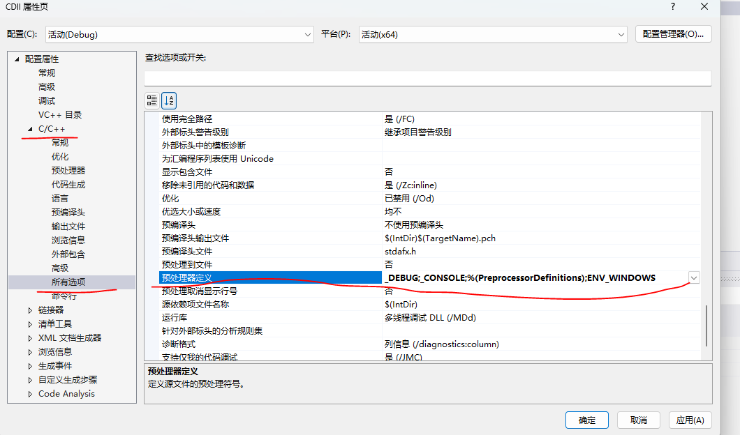 2.修改VisualStudio中CDLL工程属性,添加ENV_WINDOWS宏定义使之可以继续生成windows下可以被调用的c dll
