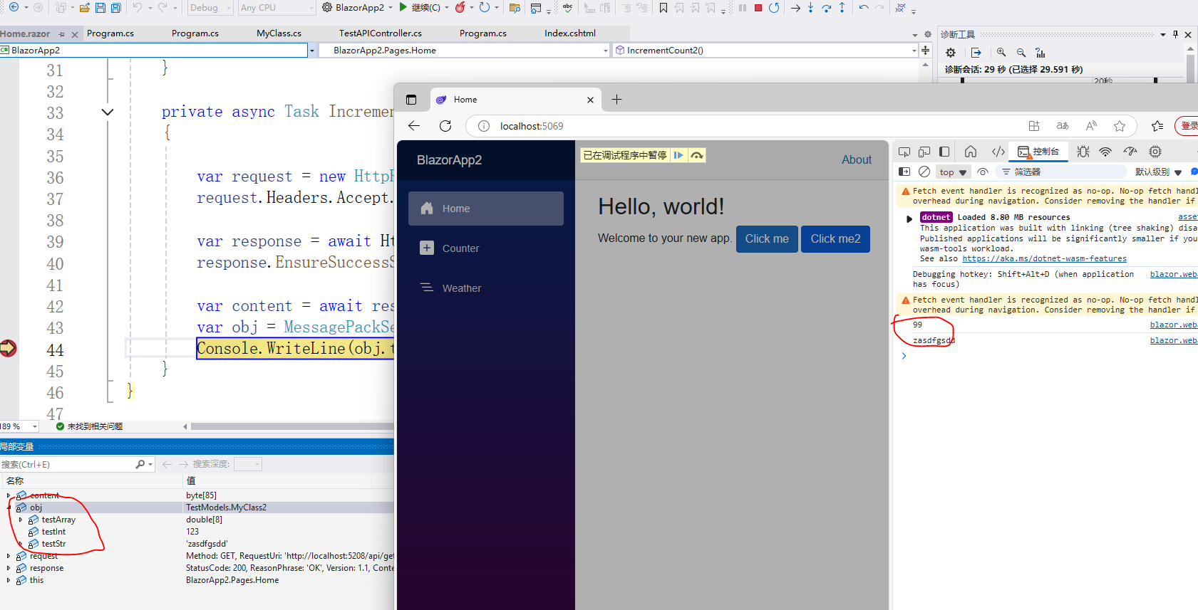 运行服务端程序和Blazor程序,点击Home页面下的按钮并在断点以及控制台查看效果。